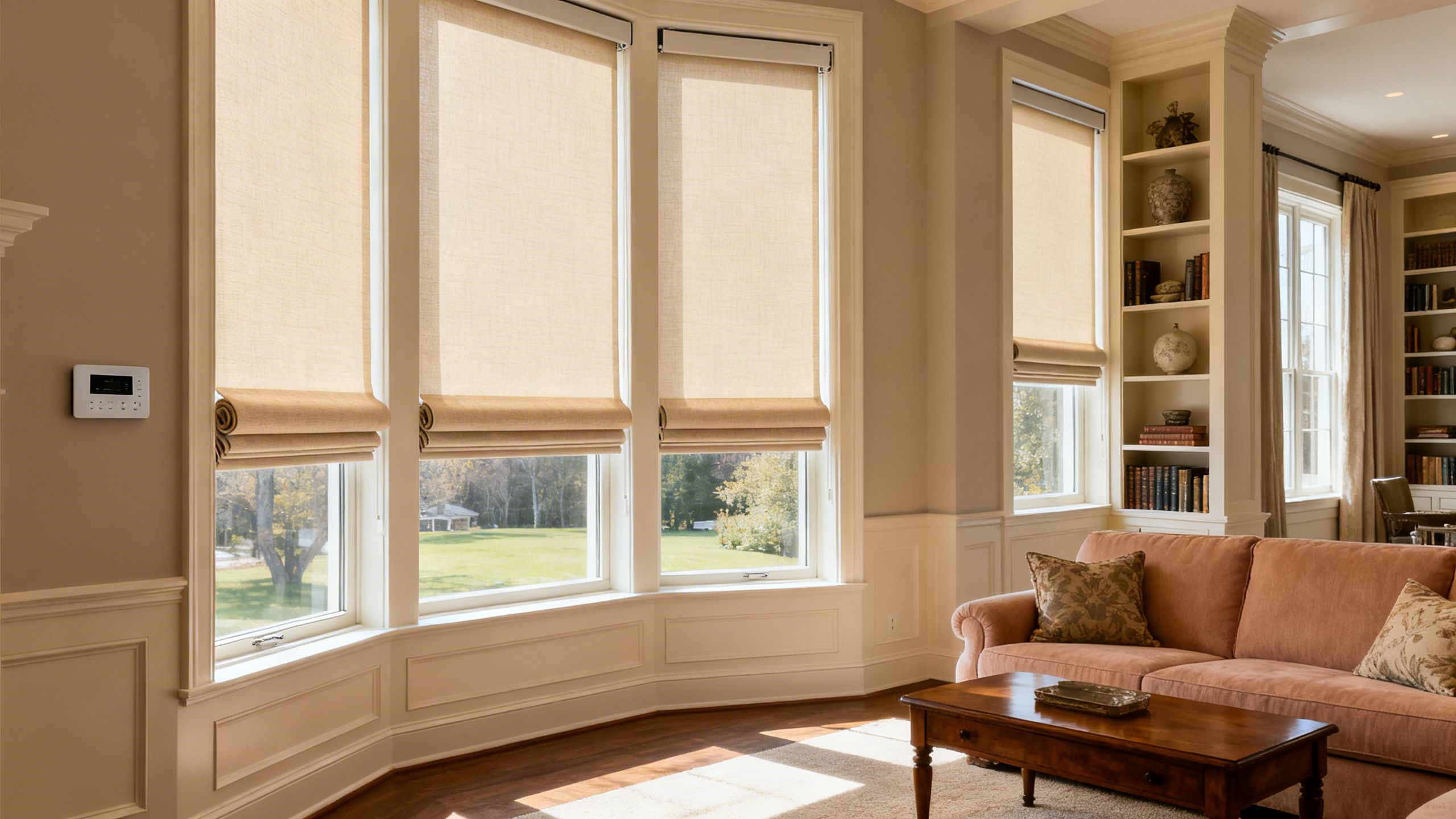 A beautiful North Jersey living room with elegant, custom-fit motorized window shades on large windows
